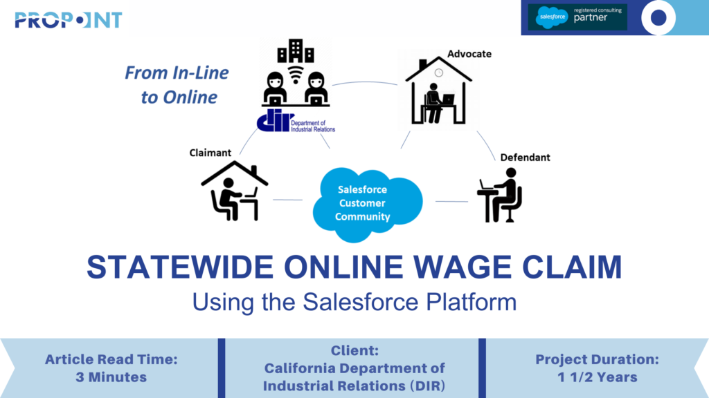 Project Overview Propoint architected a comprehensive and thoroughly integrated statewide online wage claim solution using Salesforce Platform Cloud. The California Department of Industrial Relations (DIR) initially only received LCO wage claim forms on paper and in person. During the COVID-19 pandemic, when business could only […]